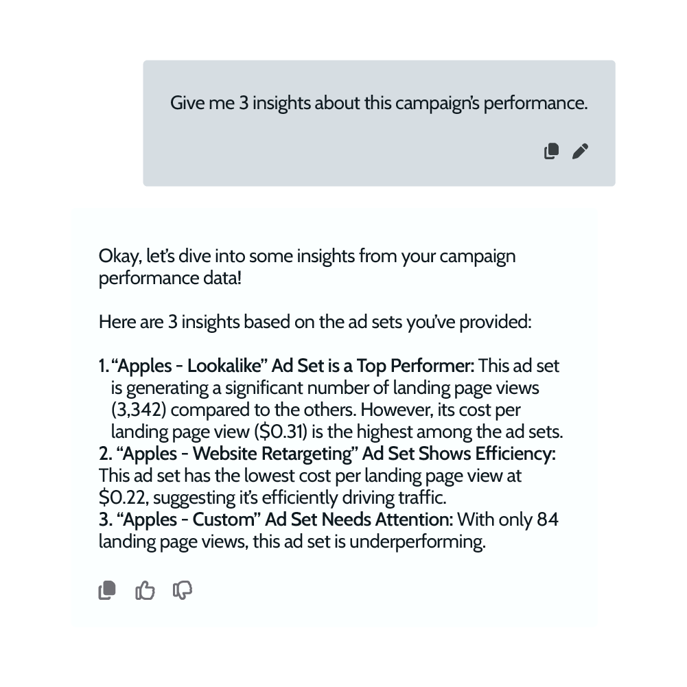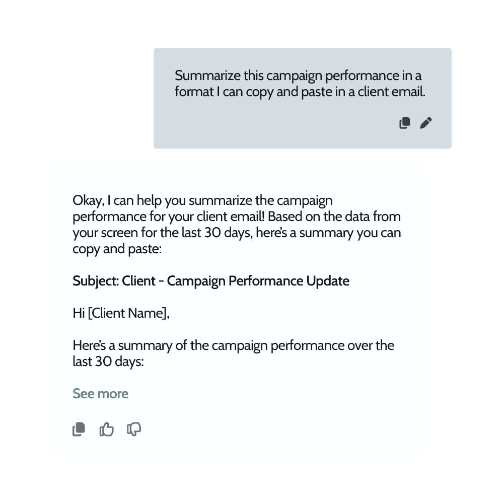 AdsCopilot can review campaign data and help draft clear, client-ready messages when questions come in.